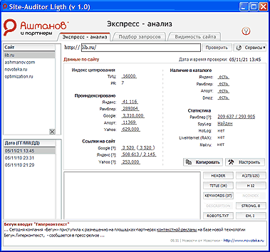 Назначение программы: С помощью утилиты Site-Auditor можно быстро собирать данные, необходимые для оценки видимости сайта в поисковых системах Инета. Одним кликом получать все необходимые данные из основных поисковых сервисов, используемых в российском сегменте Интернета: Яндекс, Рамблер, Апорт, а также в наиболее популярных международных сервисах Google и Yahoo. В случае, обнаружения на анализируемом сайте счётчика Рамблер ТОП100, утилита проведёт сбор данных о количестве посетителей и просмотренных страницах за последние 7 дней. Если будут обнаружены счётчики других статистических систем, на них будут даны ссылки. Система определяет наличие следующих счётчиков статистики: * Рамблер Top100, * Mail.ru, * LiveInternet (RAX), * SpyLog, * HotLog. Утилита позволяет получить позиции сайта в выдаче Яндекс, Рамблер и Google по выбранному списку запросов (семантическому ядру). Все собираемые данные сохраняются на компьютере и позволяют отслеживать историю изменений. В нижней части окна утилиты находится информационное поле, отображающее объявления и новости по SEO тематике. Это позволит всегда быть в курсе последних новостей и событий, происходящих на рынке SEO услуг. Экспресс - анализ: В разделе "Экспресс-Анализ" можно собирать основные данные о текущем уровне оптимизации сайта. Проведение исследования выполняется следующим образом. В верхней части окна программы находится поле http://, в которе вводится адрес исследуемого сайта. При нажатии кнопки проверить программа начнёт сбор данных. С помощью программы можно получить информацию об анализируемом сайте: * Индексы цитирования Яндекса - ТИЦ и Google - PageRank; * Количество страниц, проиндексированных поисковыми системами Яндекс, Рамблер, Google, Апорт и Yahoo. * Количество ссылок на сайт, обнаруженных поисковыми системами Google, Яндекс, Yahoo. * Данные о наличии сайта в каталогах Яндекс, Рамблер Top100, Апорт и DMOZ. * Если на сайте будет обнаружен счётчик Рамблер Top100, утилита соберёт данные о количестве посетителей и просмотренных страниц за последние 7 дней. * При обнаружении счётчиков статистических систем Top.Mail.ru, LiveInternet (Rax), SpyLog, HotLog, будут даны ссылки на страницы этих поисковых систем. Одновременно со сбором данных производится анализ титульной страницы сайта на наличие тегов и блоков информации: * HEADER - содержит заголовок ответа сервера. Если в процессе получения ответа произошло перенаправление сайта (HTTP Redirect), на кнопке HEADER появится признак R. При клике на кнопку, в информационном окне показываются заголовки, выданные web-сервером при перенаправлении и выдаче страницы. Для получения дополнительной информации по заголовку можно воспользоваться внешним сервисом HTTP Header. * TITLE - показывает содержимое тега <title>. На кнопке в скобках отображается кол-во символов содержимого тега. * KEYWORDS - показывает содержимое тега <meta keywords>. На кнопке в скобках отображается кол-во символов содержимого тега. * DESCRIPTION - показывает содержимое тега < meta description>. На кнопке в скобках отображается кол-во символов содержимого тега. * ROBOTS.TXT - показывает содержимое файла robots.txt. Если в файле обнаружено правило, полностью запрещающее индексацию сайта (Disallow: /), на кнопке выводится предупреждение в виде восклицательного знака. * A - показывает содержимое тегов <a>. На кнопке в скобках отображается общее количество обнаруженных ссылок и количество ссылок, на внешние сайты. Домены третье