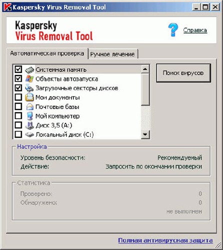Kaspersky AVP Tool - бесплатная утилита для борьбы с вирусами от разработчиков Касперского. Программа не имеет всех функций полноценного антивируса. Позволяет просканировать любой указанный файл и, при обнаружении вируса, удалить его или переместить в "карантин" (проверяйте компьютер с помощью Kaspersky AVP Tool в безопасном режиме). Не имеет функций постоянной защиты компьютера и обновлений антивирусных баз. Обратите внимание: в случае необходимости удалить программу в настройках нужно убрать галку с "enable self-defense".