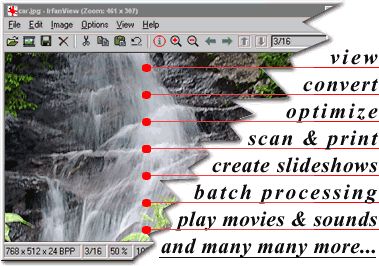 IrfanView - мощная и компактная программа просмотра, редактирования изображений и конвертации графических файлов с продвинутыми возможностями. Поддержка множества форматов графики (более 30), плагинов, конвертации изображений, различных режимов просмотра. IrfanView понимает и многие аудио и видеоформаты. В IrfanView имеются базовые средства обработки графики, можно конвертировать файлы из одного формата в другой, делать скриншоты экрана, заставки для рабочего стола, есть режимы слайдшоу и показ уменьшенных копий, а также функция вытаскивания иконок из *.exe и *.dll файлов и многое другое. Плюс программы - её небольшой размер.