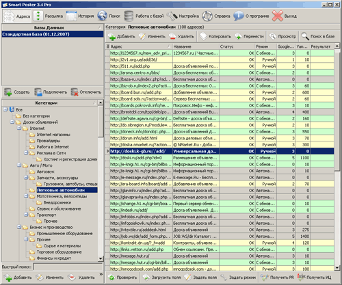 Ручное размещение информации на досках объявлений и каталогах ресурсов - долгий и утомительный процесс. Теряются многие часы драгоценного времени на выполнение рутинной и нудной работы - заполнение множества регистрационных форм. Smart Poster - мощная программа, предназначена для автоматизации процесса рассылки на доски объявлений, каталоги ресурсов, FFA, форумы, новостей на новостные порталы, гостевые книги и везде, где есть веб-формы. Достаточно один раз настроить программу на тот или иной каталог (доску), чтобы в дальнейшем производить рассылку одним щелчком мышки. По сути, SmartPoster - универсальный сабмиттер любых web форм. В программу встроен анализатор выдачи результатов поисковиков на наличие веб-форм! Есть возможность редактирования базы! Возможность многопоточной отправки делает Смарт Постер одной из самых быстрых программ для размещения объявлений, даже на обычной модемной связи Вы будете удивлены скоростью работы программы. Программа поставляется с готовой базой, содержащей больше тысячи досок и каталогов. Полная совместимость с Windows Vista и UAC. Основные возможности программы: * Многопоточный модуль рассылки позволяет производить рассылку с максимально возможной для используемого интернет-соединения скоростью; * Мощнейший парсер, работающий как с объектно-ориентированной моделью документа так и с простым текстом, позволяет добавлять в базу программы любые доски, каталоги, гостевые книги, и производить в них рассылку независимо от того используют ли они Java-скрипты, сесии, куки, контрольные картинки, динамически изменяющиеся поля и пр; * Поддержка многостраничных форм. Вы можете внести в базу данных программы сложные формы, сабмит которых состоит из нескольких этапов (например, заполнение формы авторизации и формы добавления сообщения). При этом поддерживается любое количество промежуточных форм (этапов); * Встроенный менеджер баз данных позволяет создавать резервные копии базы данных, импортировать / экспортировать списки адресов, группировать списки по категориям, оперативно проверять адреса на доступность с целью выявления нерабочих ресурсов; * Функция автоматического поиска новых досок объявлений и каталогов ресурсов. Программа содержит парсер выдачи четырёх основных поисковых систем (Google, Яндекс, Yahoo, MSN). Достаточно написать поисковый запрос и программа самостоятельно обойдёт все страницы с выдачей системы, перейдёт на каждый адрес, проанализирует страницу на предмет наличия форм и соответствие её полей заданным критериям, после чего найденные адреса будут добавлены в базу данных программы. Пакетный режим задания значений полей позволяет легко настроить все найденные адреса на рассылку; * Поддержка возможности проведения рассылок через прокси-сервера; * Функция определения Google PR и индекса цитирования Яндекса; * Функция проверки адресов на предмет существования; * Встроенный прокси менеджер с функцией проверки прокси серверов на предмет существования. Поддерживаются Socks и Http прокси; * Модульность базы данных. Вы можете легко создавать базы данных со своими категориями и адресами. Базы легко сохранить в один файл, для переноса на другую машину. В процессе сохранения базы в файл ее можно зашифровать для последующего обмена или продажи; * Продвинутый поиск адресов внутри базы данных программы по любым критерия